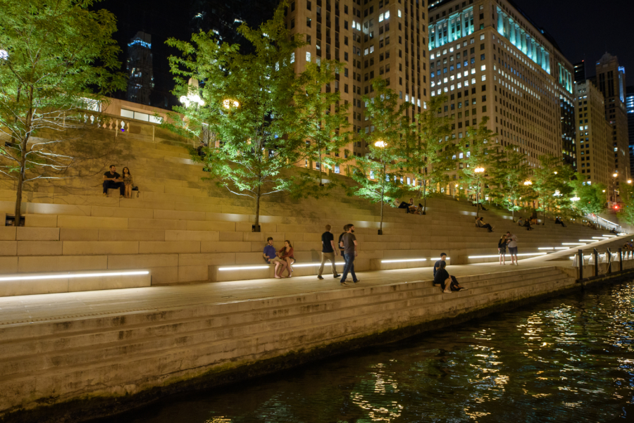 Explore the Chicago Riverwalk after dusk, and you’ll be wowed by Art on theMART, the world’s largest digital art projection, displayed on 2.5 acres of theMART’s Riverwalk-facing facade (Wednesday to Sunday from March through April and daily from May through December). Then stroll the Riverwalk’s coves to discover wining and dining, boat excursions, and even more public art.